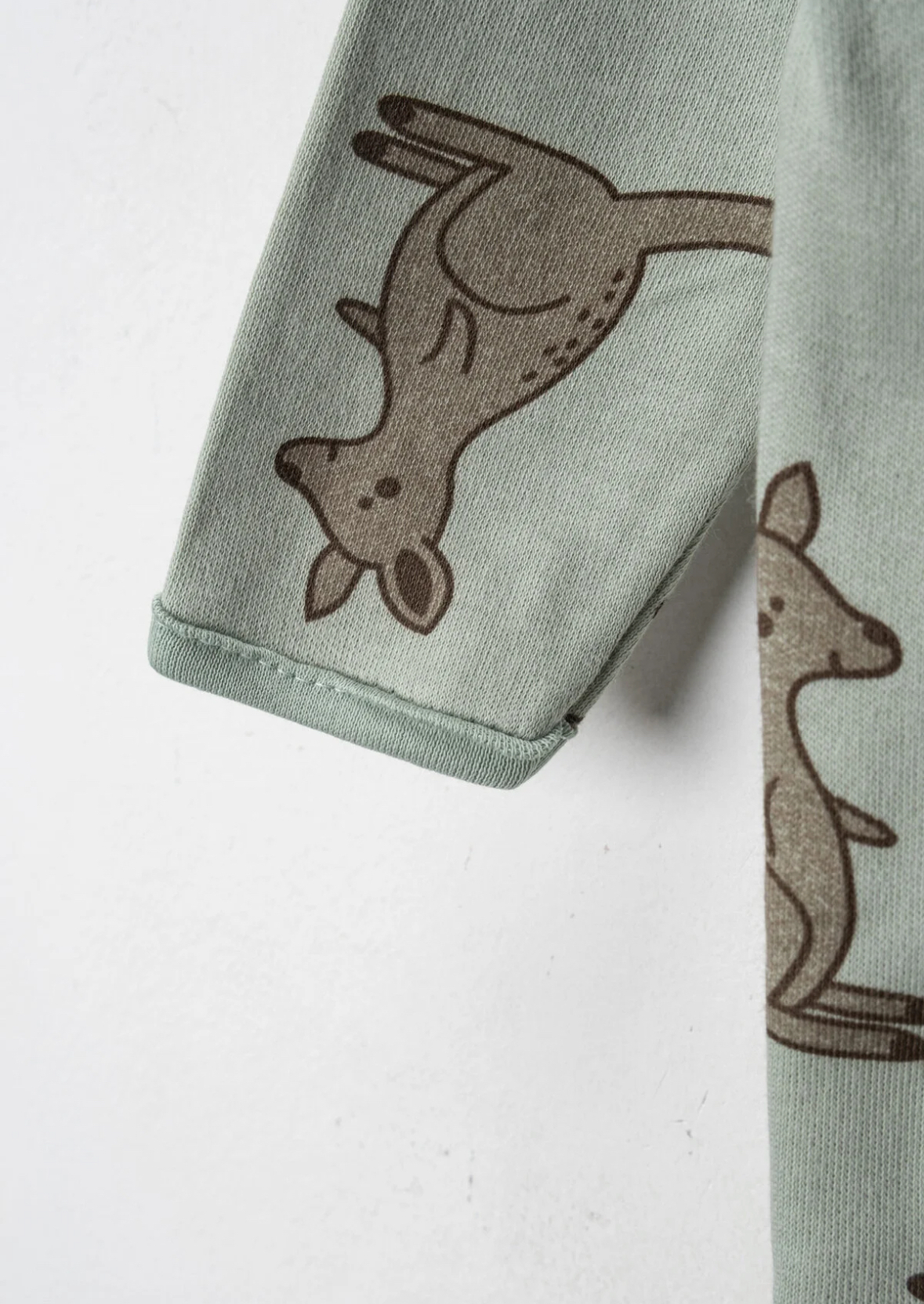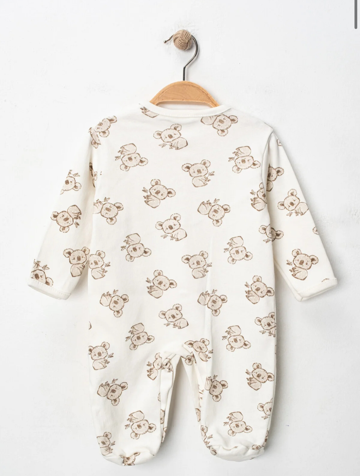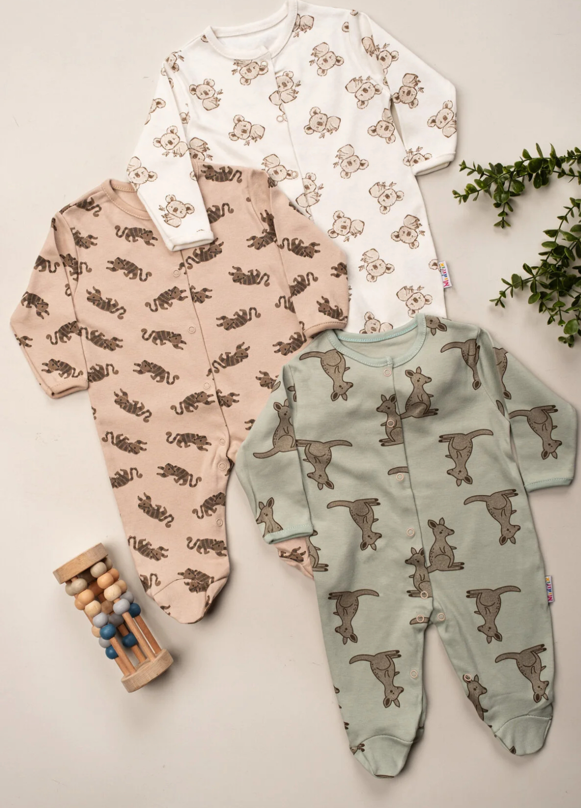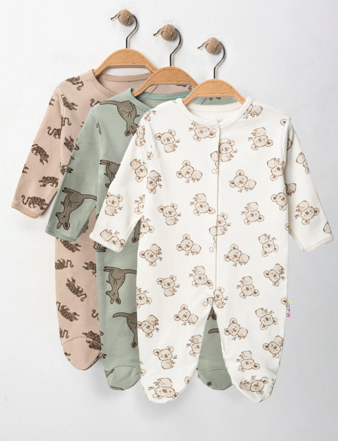 ست سه‌تایی سرهمی نوزاد با طرح کانگورو و کوآلا، ۱۰۰٪ پنبه‌ای، سایزهای ۳–۶–۹ ماه، پا‌دار (پاتیک‌دار)، مناسب نوزادان ۳ تا ۹ ماهه.