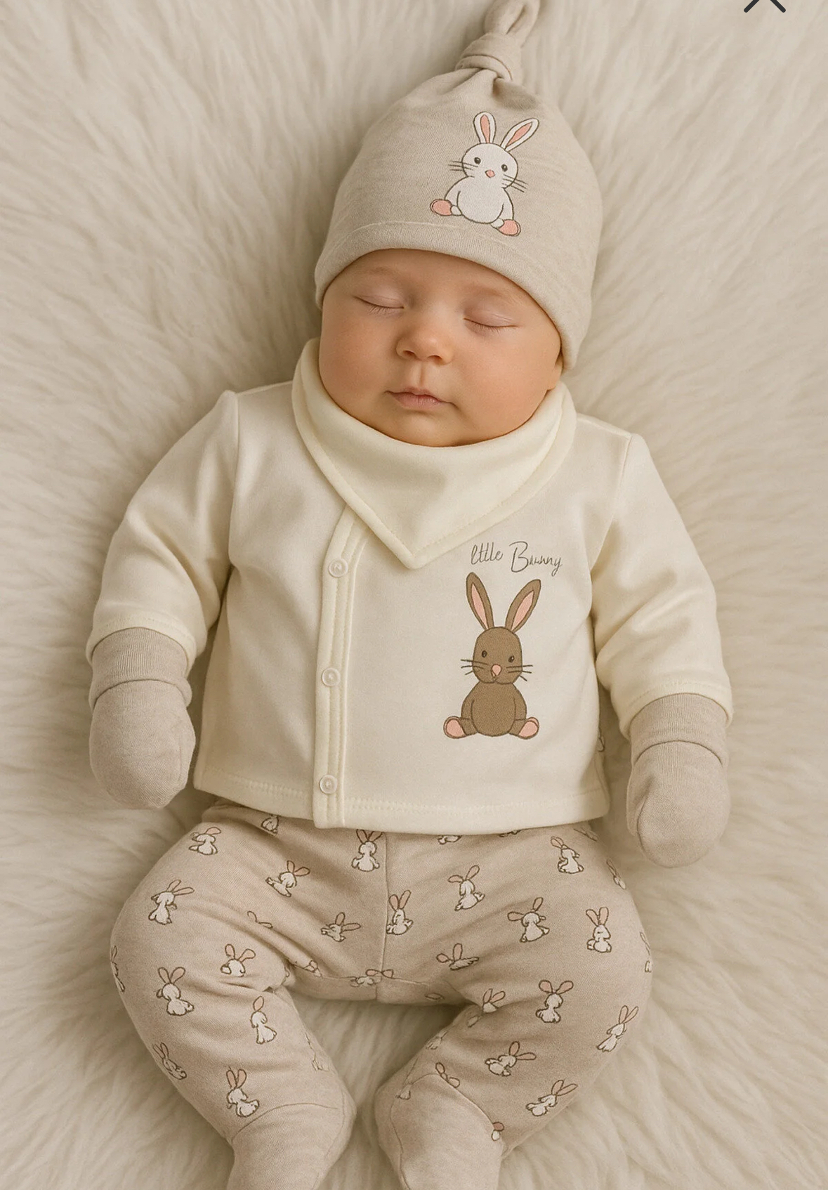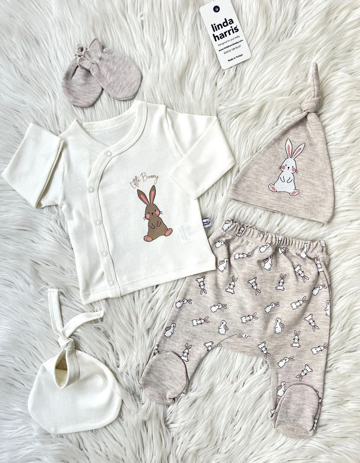 «ست ۵ تکهٔ خروج از بیمارستان نوزاد برند Linda Harris — مدل Little Bunny، رنگ اکرو-بژ ملانژ (کرم مایل به بژ).