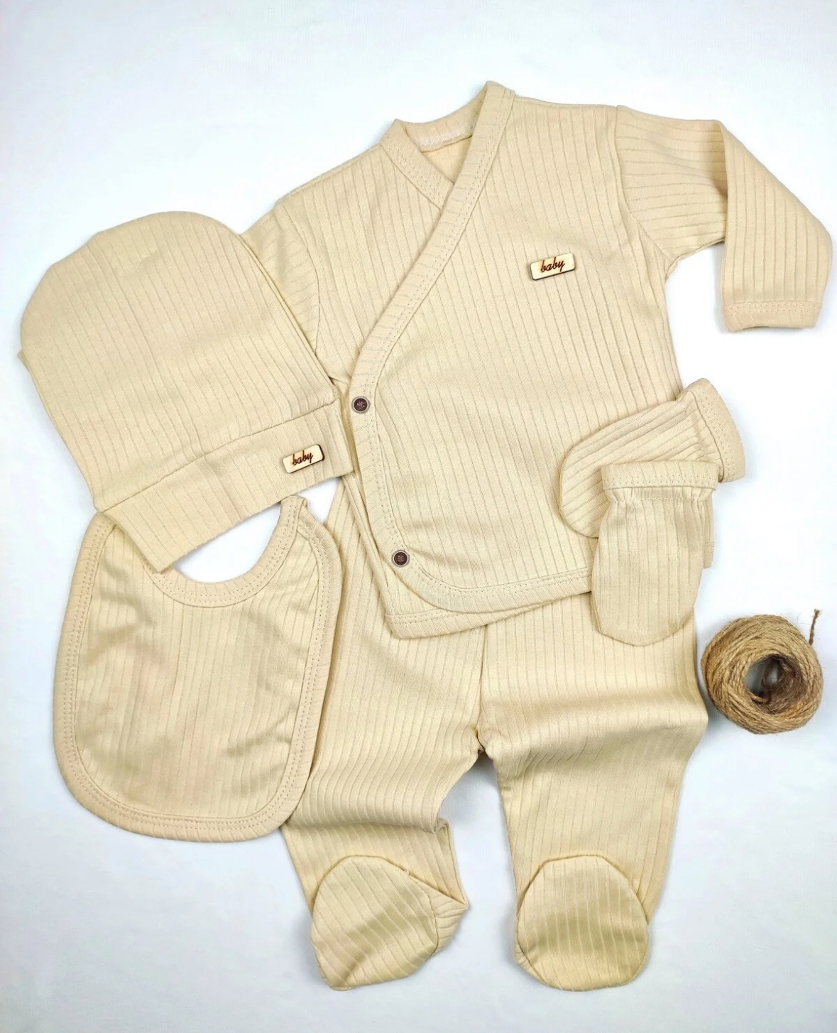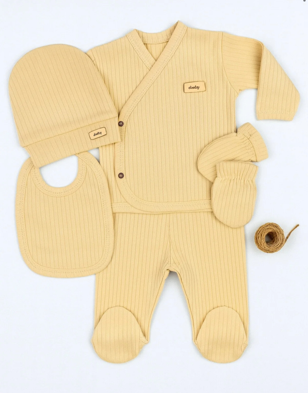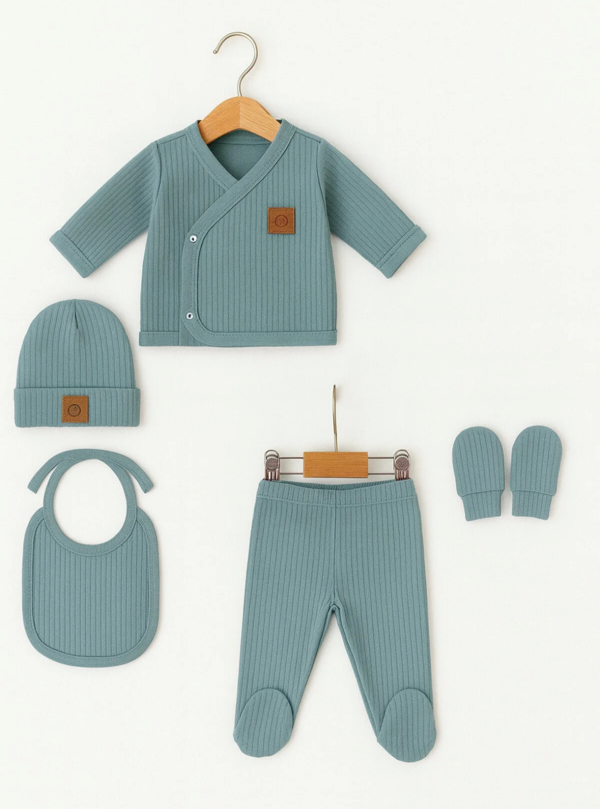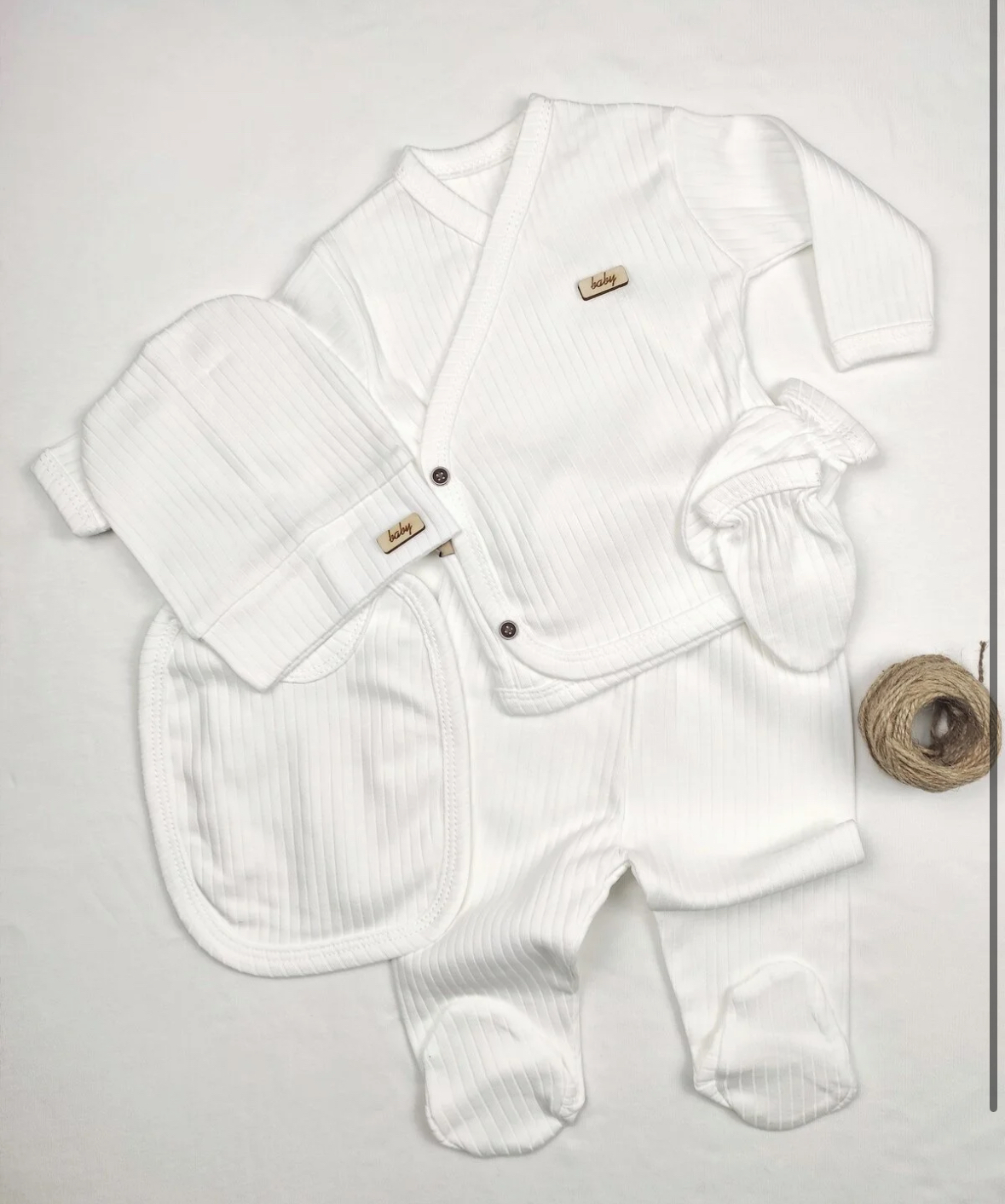 «ست ۵ تکهٔ نوزاد OMY — مدل فیتیلدار (ribbed)، مخصوص خروج از بیمارستان برای نوزاد تازهمتولد.