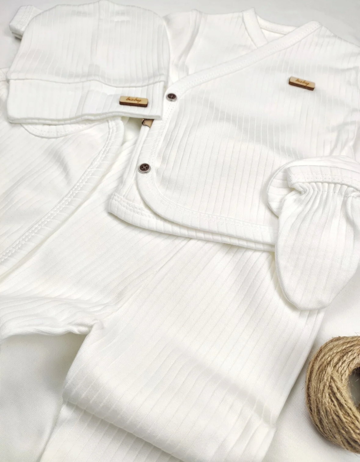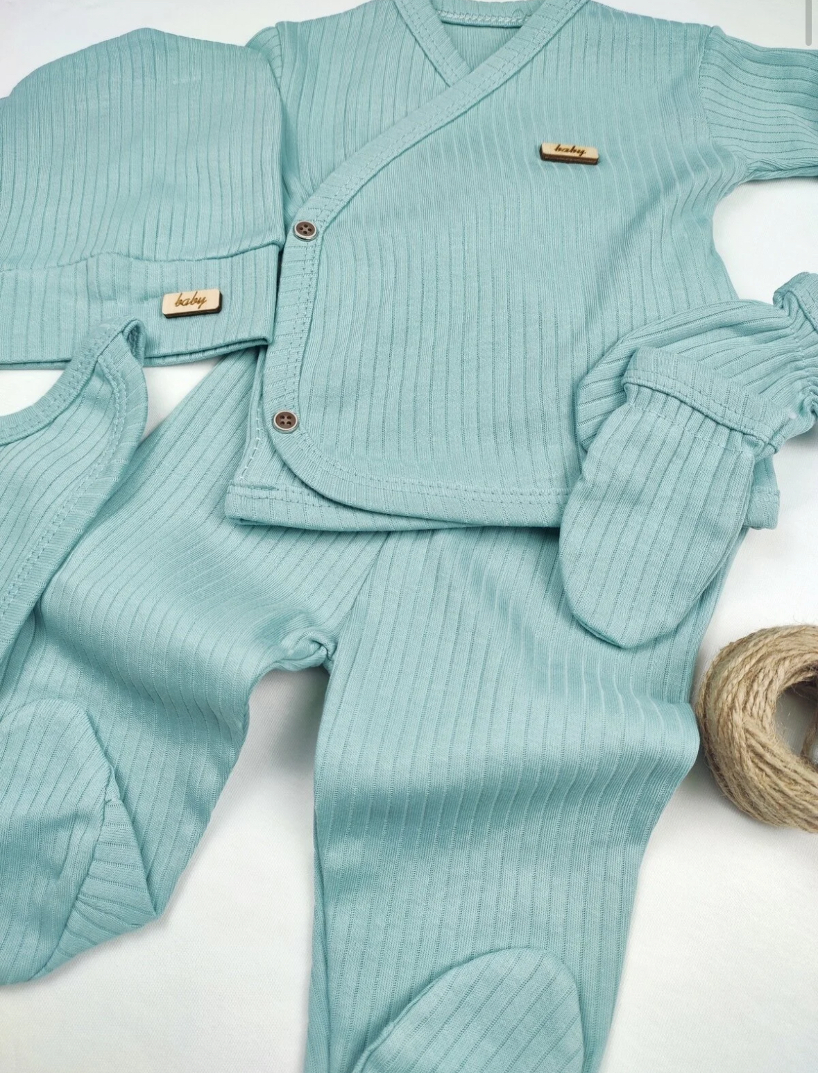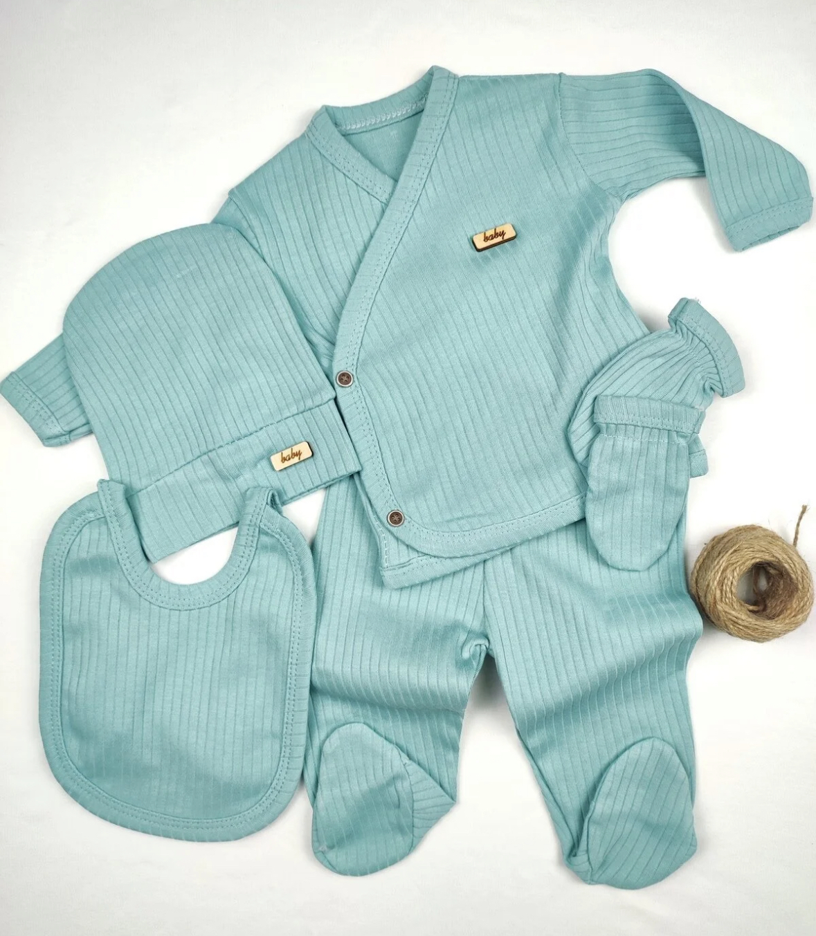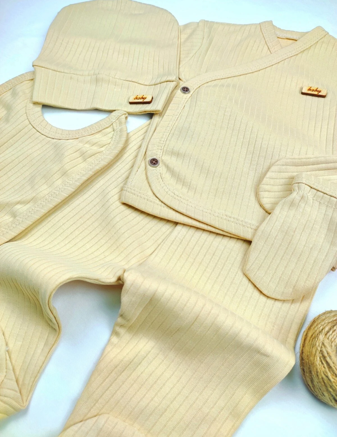 «ست ۵ تکهٔ نوزاد OMY — مدل فیتیلدار (ribbed)، مخصوص خروج از بیمارستان برای نوزاد تازهمتولد.
