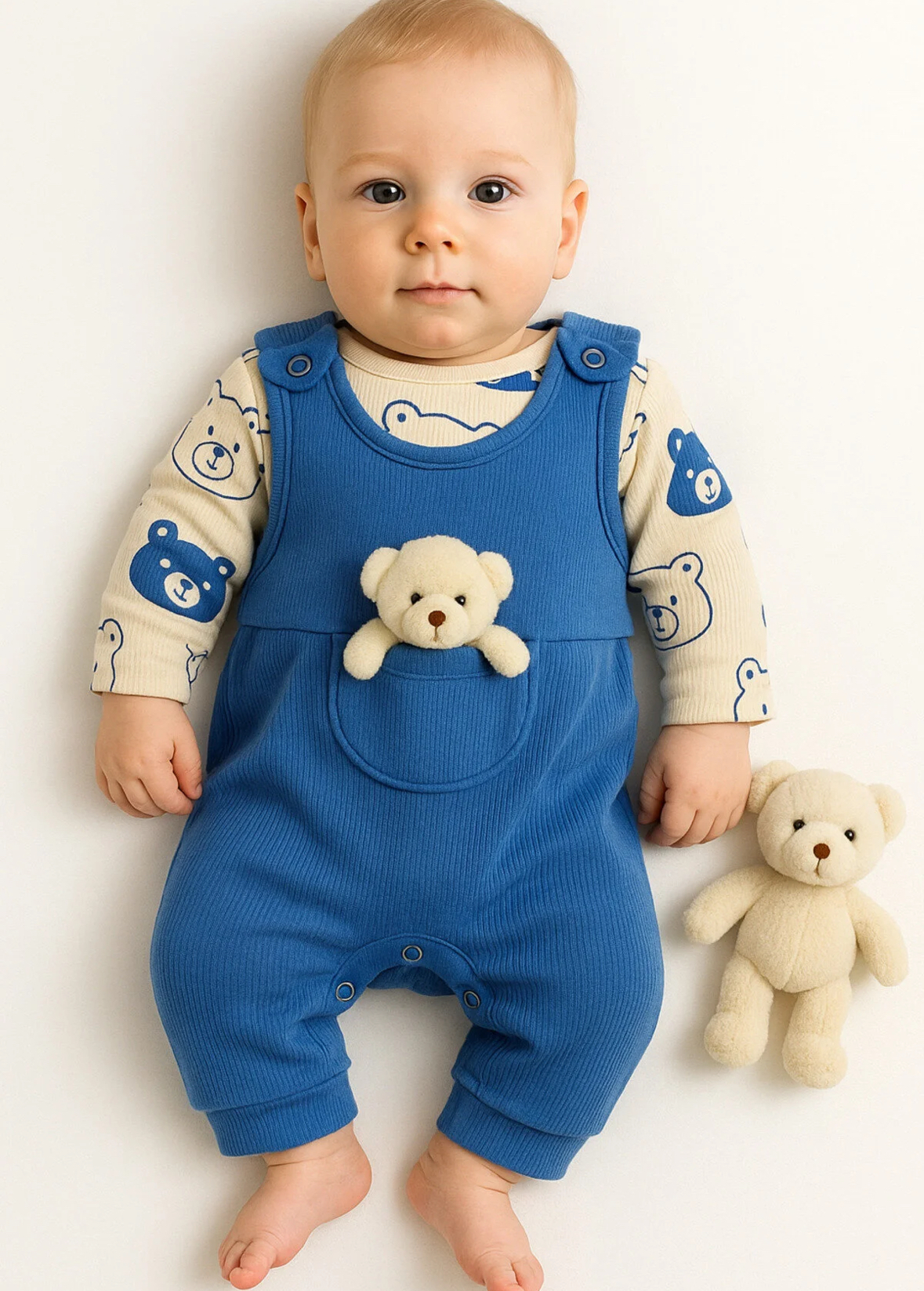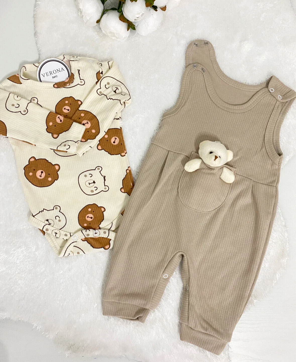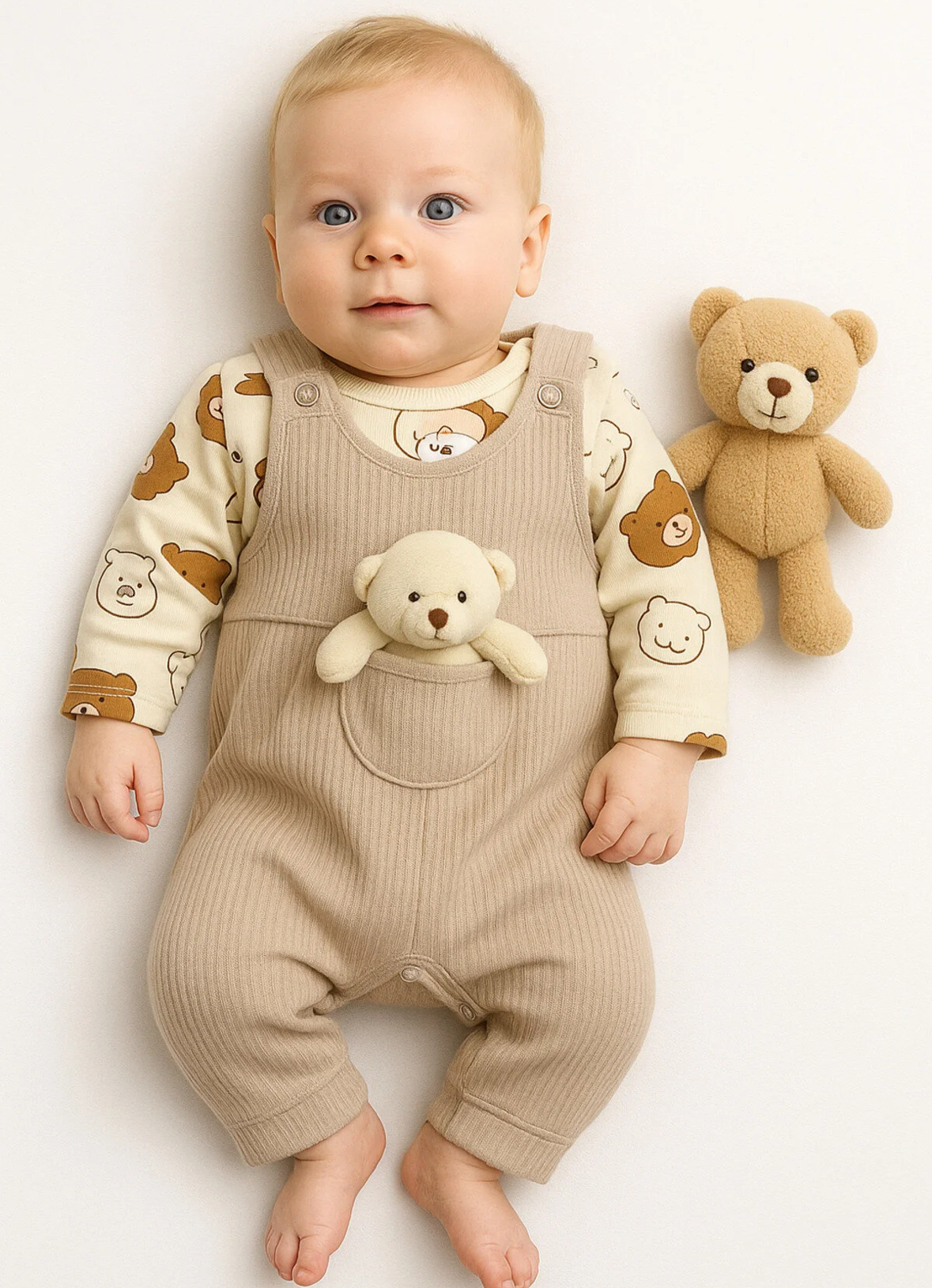 ست سرهمی ۲ تکه نوزاد پسر با طرح خرس عروسکی، آستین بلند و دکمه فشاری