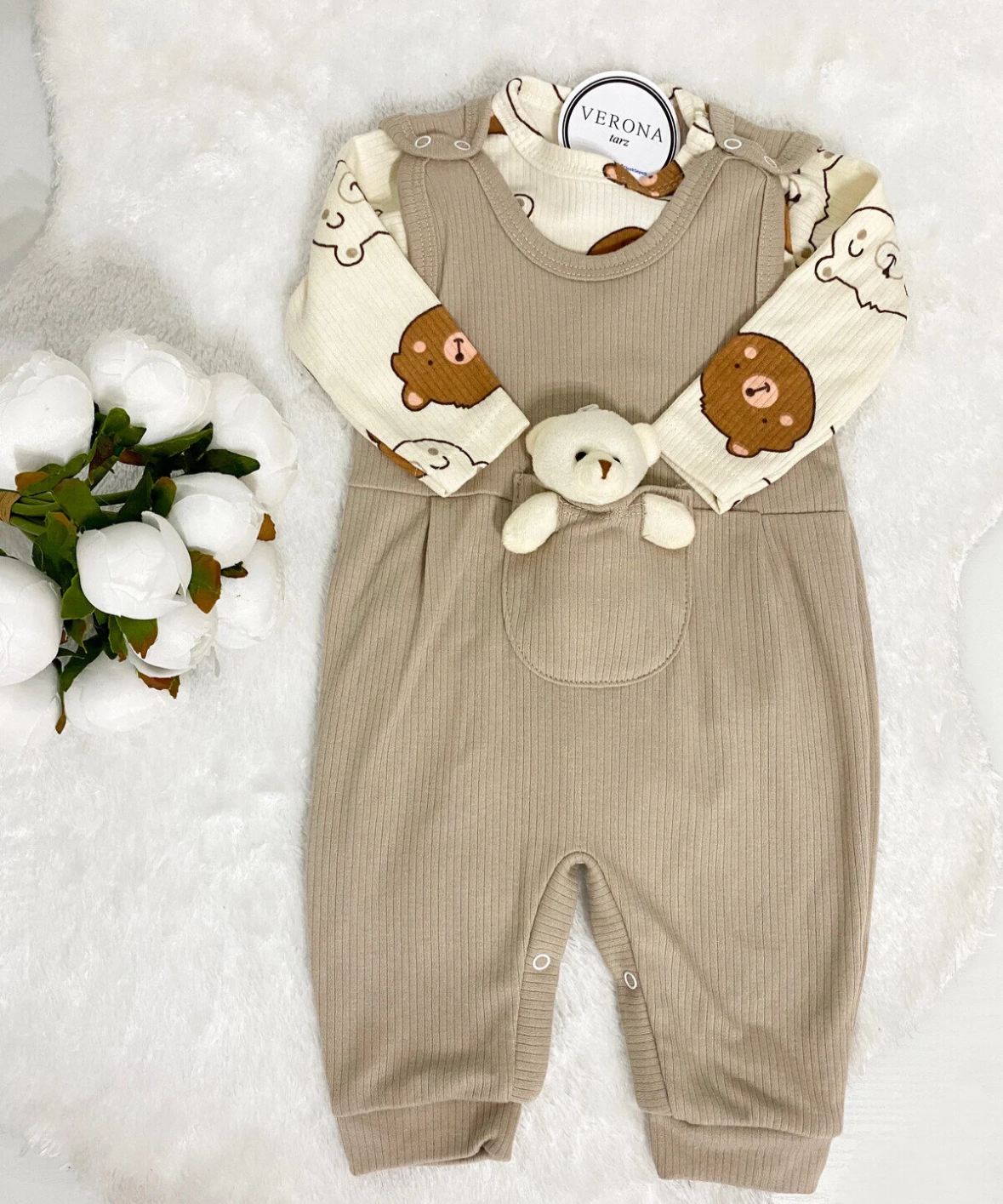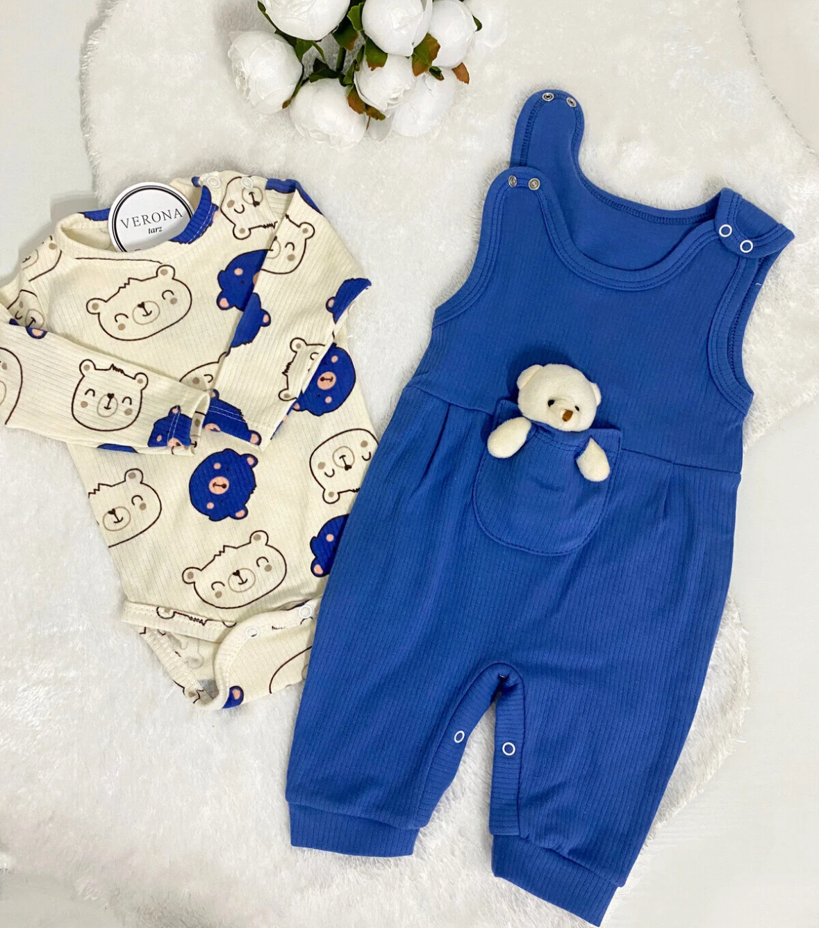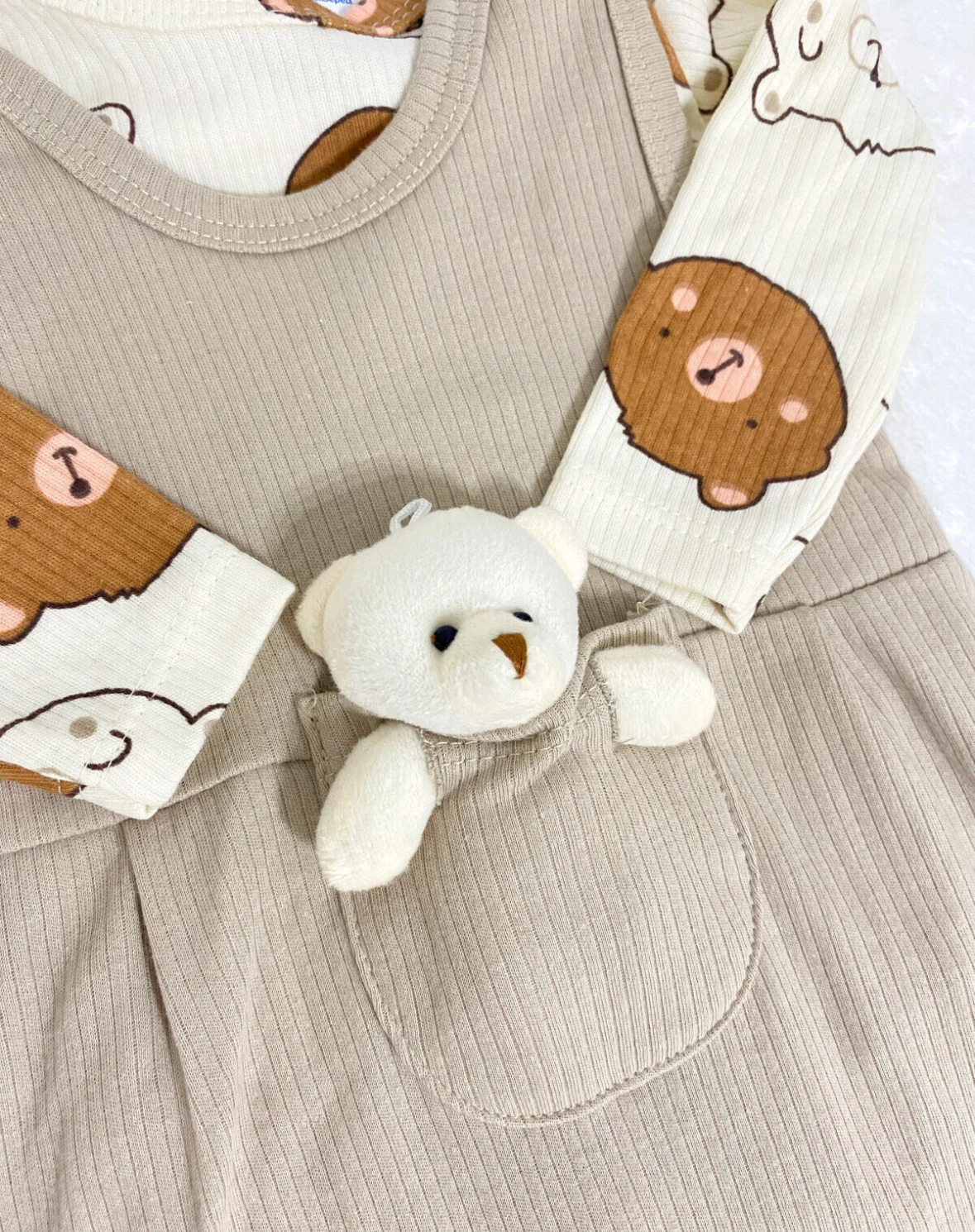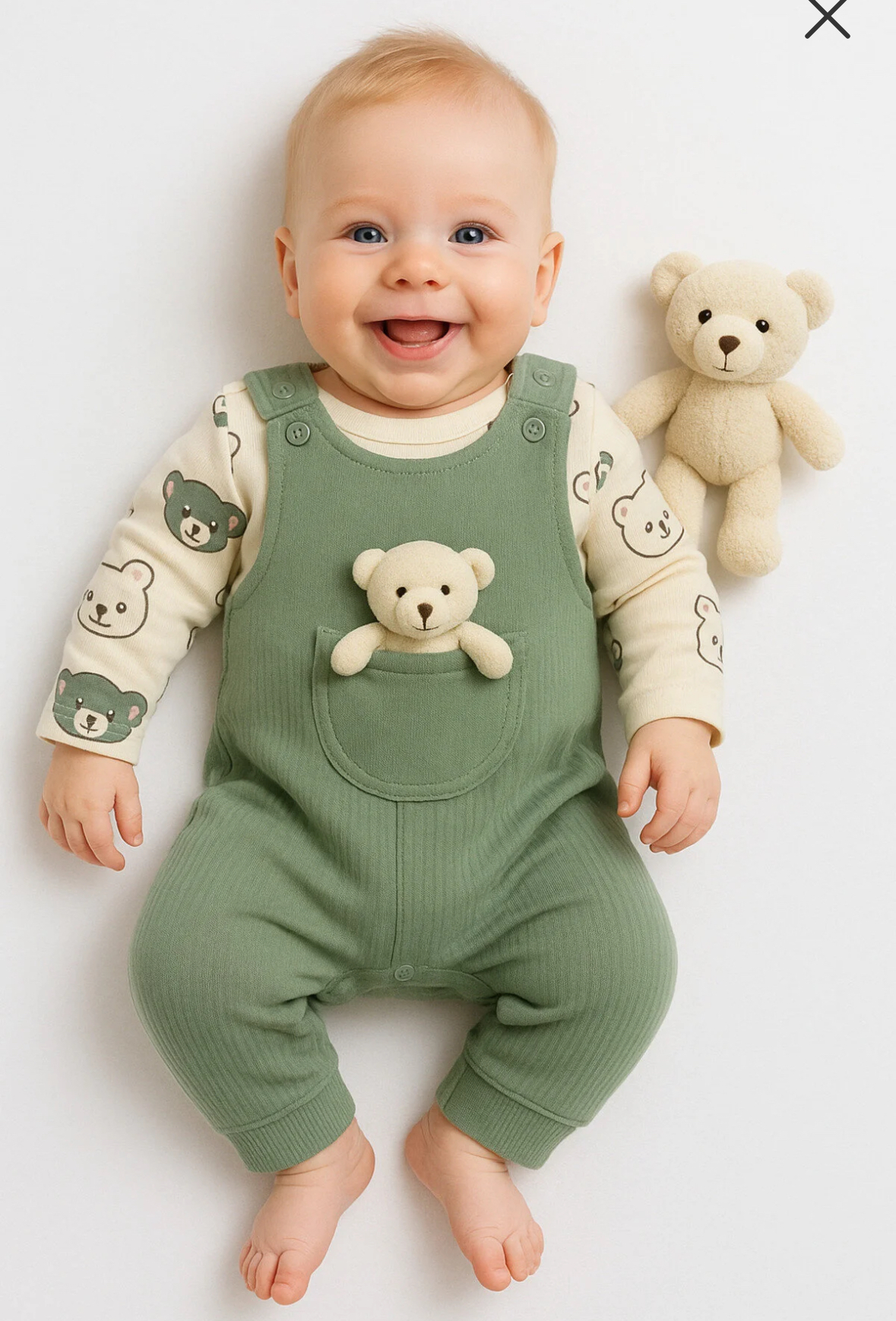 ست سرهمی ۲ تکه نوزاد پسر با طرح خرس عروسکی، آستین بلند و دکمه فشاری